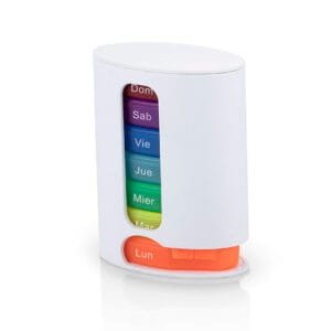 Pastillero semanal de colores con 7 compartimientos asignados para cada día de la semana. Cierre a presión.